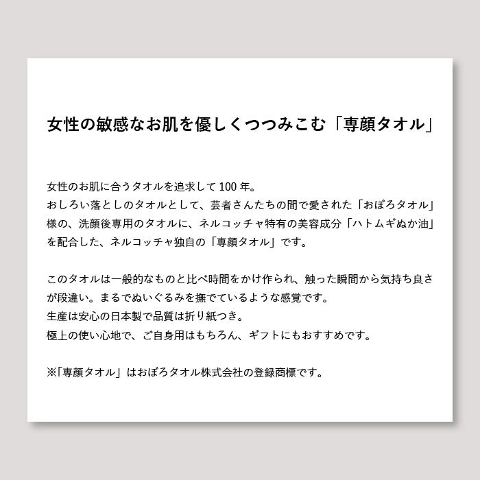 女性のお肌に合うタオルを追求して100年。おしろい落としのタオルとして、芸者さんたちの間で愛された「おぼろタオル」様の、洗顔後専用のタオルに、ネルコッチャ特有の美容成分「ハトムギぬか油」を配合した、ネルコッチャ独自の「専顔タオル※1」です。
