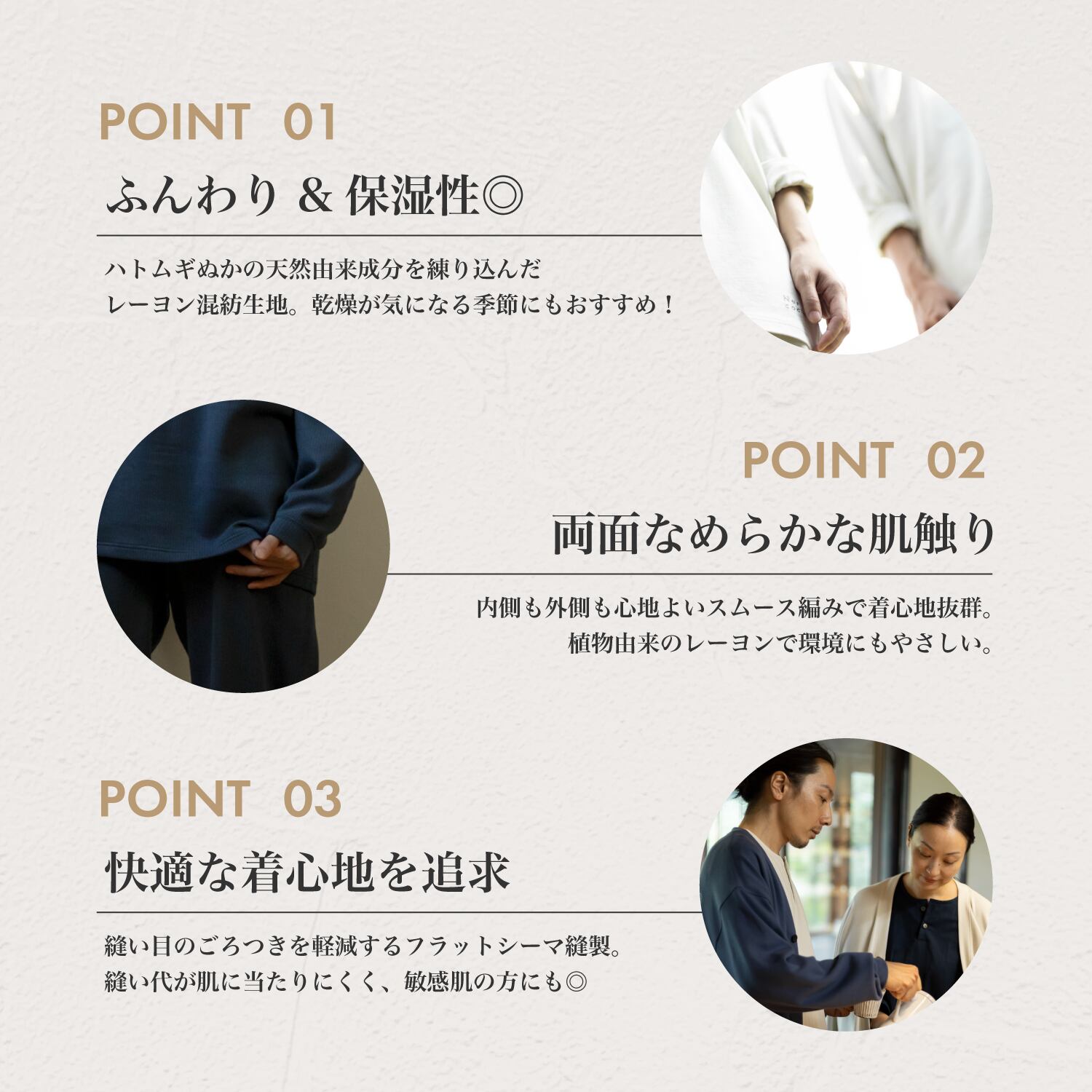 通常のスムース編にくらべて膨らみがあり生地に空気層が含まれることで保温性に優れています。また、保湿感のある生地なので乾燥が気になる肌寒い季節にもオススメです。