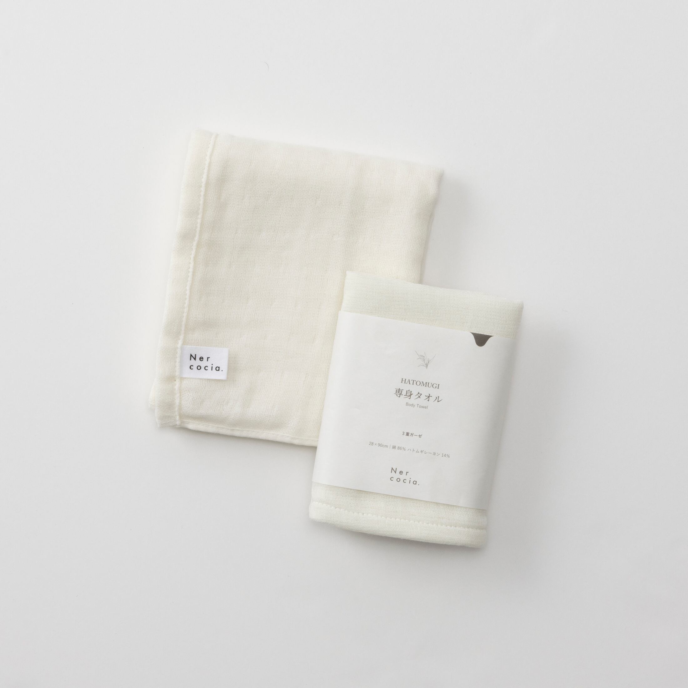 お肌に合うタオルを追求して100年。おしろい落としのタオルとして、芸者さんたちの間で愛された「おぼろタオル」様の、身体洗い専用の特別なタオルに、ネルコッチャ特有の美容成分「ハトムギぬか油」を配合した、ネルコッチャ独自の「専身タオル※1」です。